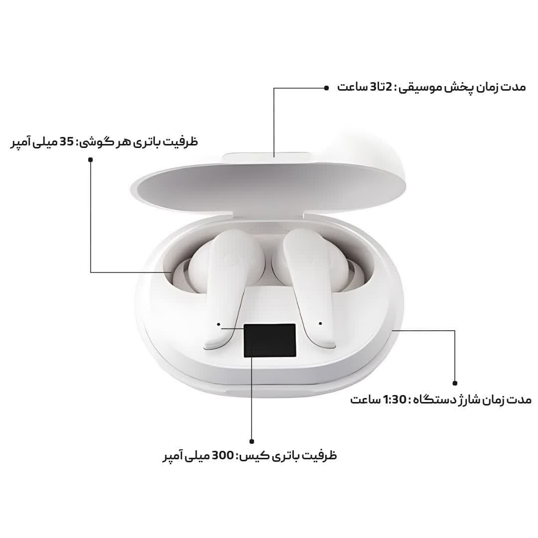 ابعاد: 65 * 42 * 32 میلی متر برد بلوتوث: تا شعاع 10 متر نسخه بلوتوث: نسخه 5 ظرفیت باتری کیس: 300 میلی آمپر